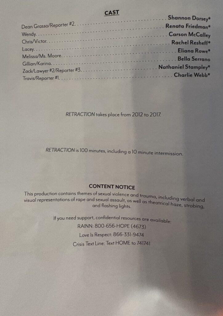 The play follows Wendy (Renata Friedman), an experienced journalist with a focus on sexual assaults occurring on college campuses. She settles on one particular rape case to be the focal point of her article — a violent gang rape, which the play takes great care to admit is far from the typical sexual assault cases reported by colleges and universities. The audience is introduced to Lacey (Rachel Resheff) who is the central figure in Wendy’s article. Her friends Chris (Carson McCalley), Melissa (Eliana Rowe), and Travis (Charlie Webb) all seem to have a different memory of the night in question and convey a multitude of conflicting emotions. Beyond that, Dean Gasso (Shannon Dorsey) the Dean of Carolina Atlantic University is vitally present as well as Zack (Nathaniel Stampley), the editor and person with ultimate approval of what gets published. Additionally there is a sexual assault survivor, Gillian (Bella Serrano) who understands the larger implications a false report may bring and Victor (Carson McCalley), another prominent journalist working to question the accuracy of Wendy’s article.
