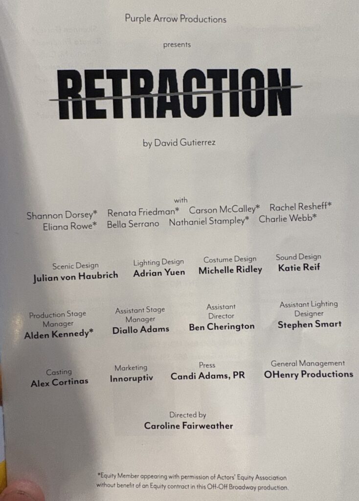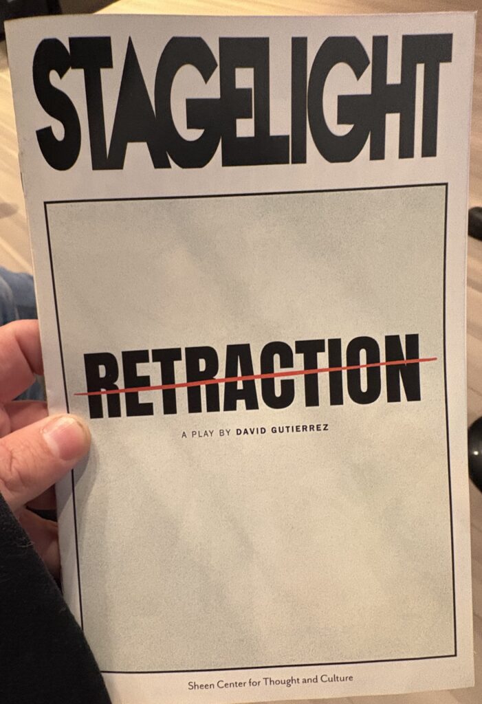 Written by David Gutierrez, Retraction is based off a true story. This play warns of the dangers caused by inaccurate journalism and does not shy away from the ramifications faced by the journalist, those mentioned in the article, and even the entire movement it intended to help.