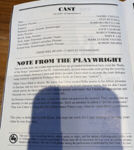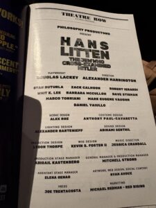 There is not a large amount of information to be found on Hans Litten, a fact stated within the playbill itself, in a note from the playwright. There are no court transcripts of the trial remaining. Even minor details including which specific Rilke poems Hans recites or the particular classical composer he loves were filled in by Lackey using a combination of research and judgement to keep the pace and vibe moving along.