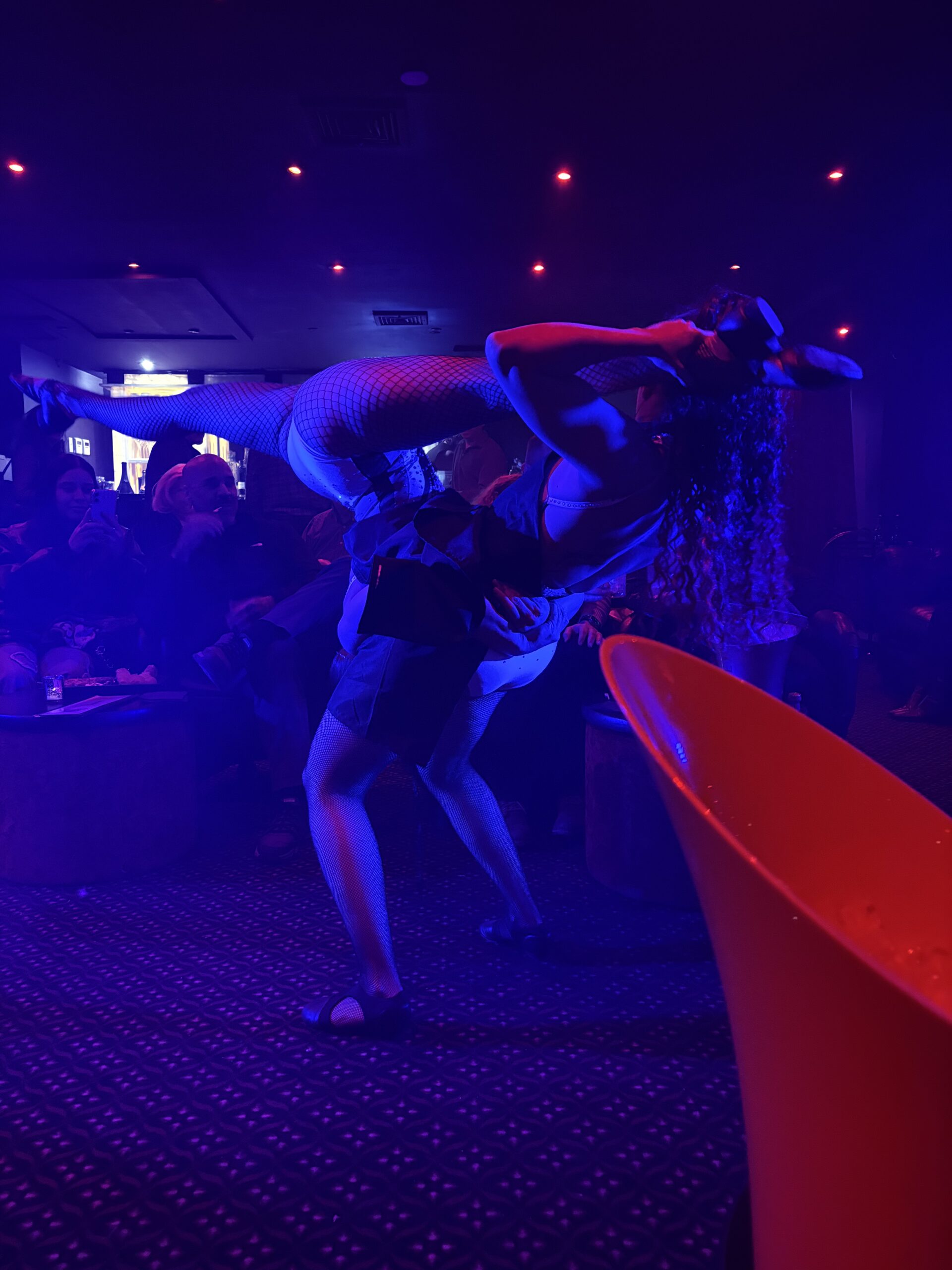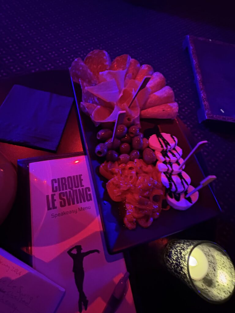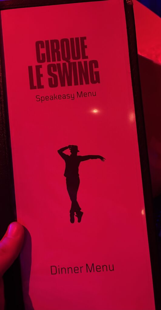 Cirque Le Swing truly is immersive, so be prepared to play a game, if asked to. They are all fairly simple, but silly. Myself and the person sat at my table were tasked with playing ring toss with the reward of our champagne being “poured in a fun way”. The rings had to be tossed around the legs of a performer, in a handstand, and doing a split. After both succeeding on the first try (a thing they claimed has never happened before), one performer climbed onto the shoulders of the other, and poured our champagne in an admittedly fun way. Other games included a ring toss around bottlenecks, tossing small objects into bowls, and other carnival style games.