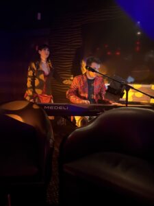 Performed inside a small and intimate venue with chairs, stools, and even sofas to help establish a relaxed, comfortable, but ultimately classy environment. The room is dimly lit and three people are in the back. One plays the keyboard (Katie-James Rushin), another plays the drums (Molly-Ellen Riviere), and the third is the host of the evening, Evie (Rori Nogee) who create a cabaret-esque vibe. The three of them make up Trio Secret who maintain the vibe and tempo through music and vocals. Once you enter the establishment and check in, one of the first people you’ll likely encounter is Mr. D. (Ambrose Martos). He takes his job very seriously. He’s the Maître D’ and takes pride in providing a fun and classy experience for his patrons.